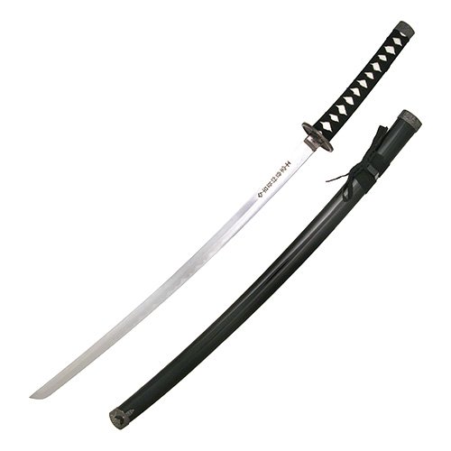 A great sword to set on display in your collection can really make it something special. The blade is an elegant stainless steel with etched Japanese characters. The handle has been wrapped in a black cord wrapping. The scabbard is finished with a glossy black lacquer. The guard, a traditional Samurai Spoke design, pommel, and end caps are cast metal in construction with intricate detailing. 39 1/2 inches overall length.