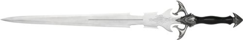 40" Overall.; Fire breathing graphic stamp on blade with blood grove.; Includes wood display plaque.